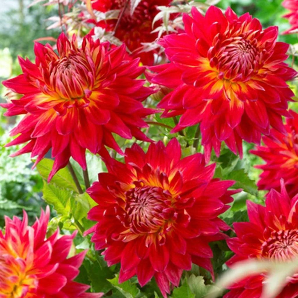 Манхэттен Айленд (Manhattan Island) – Декоративное растение до 90 см в высоту. Цветет с июня по сентябрь. Соцветия красные, с желтым оттенком от 15 до 20 см в диаметре. При правильном уходе георгины сорта Манхэттен Айленд устойчивы к болезням и вредителям.